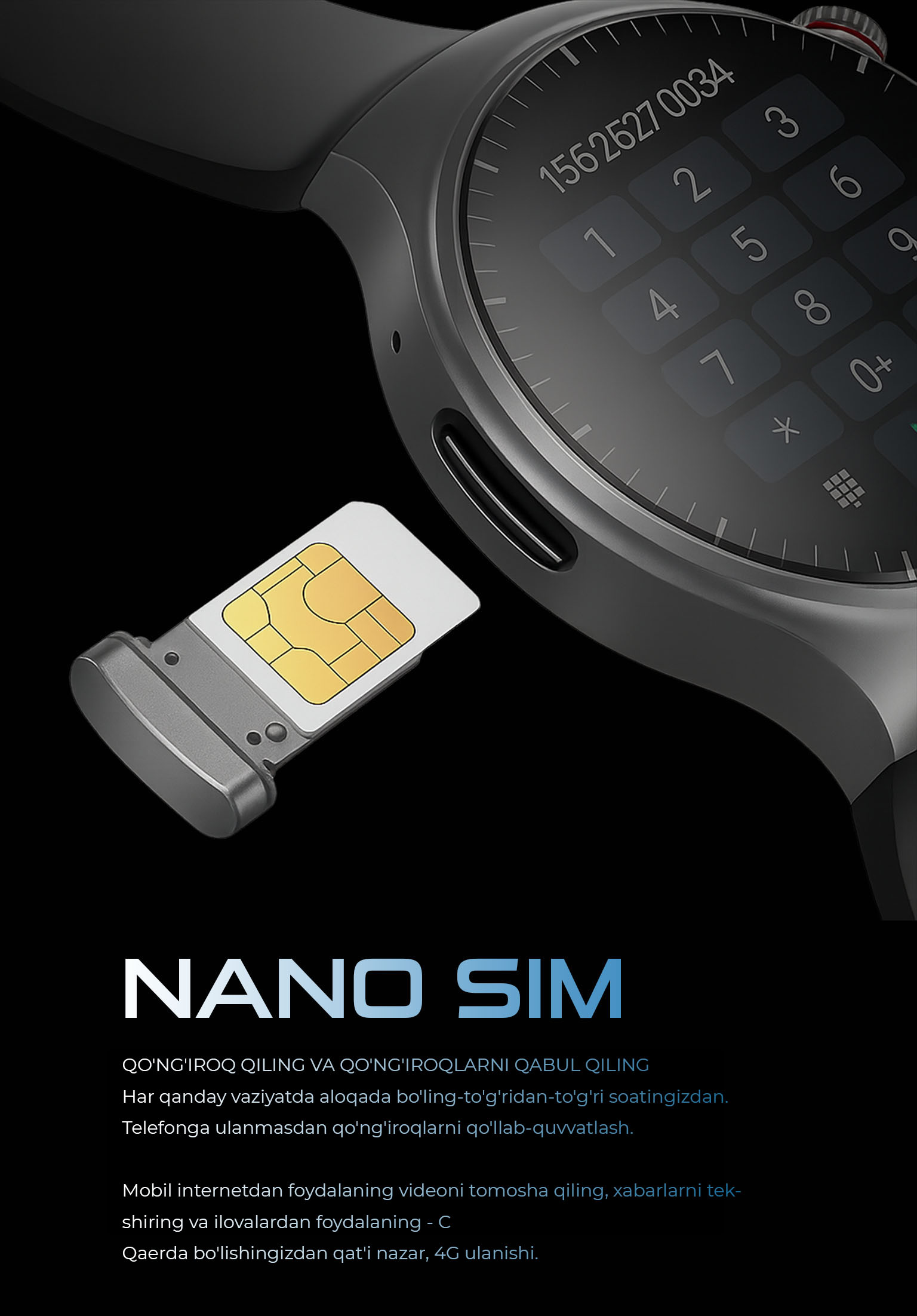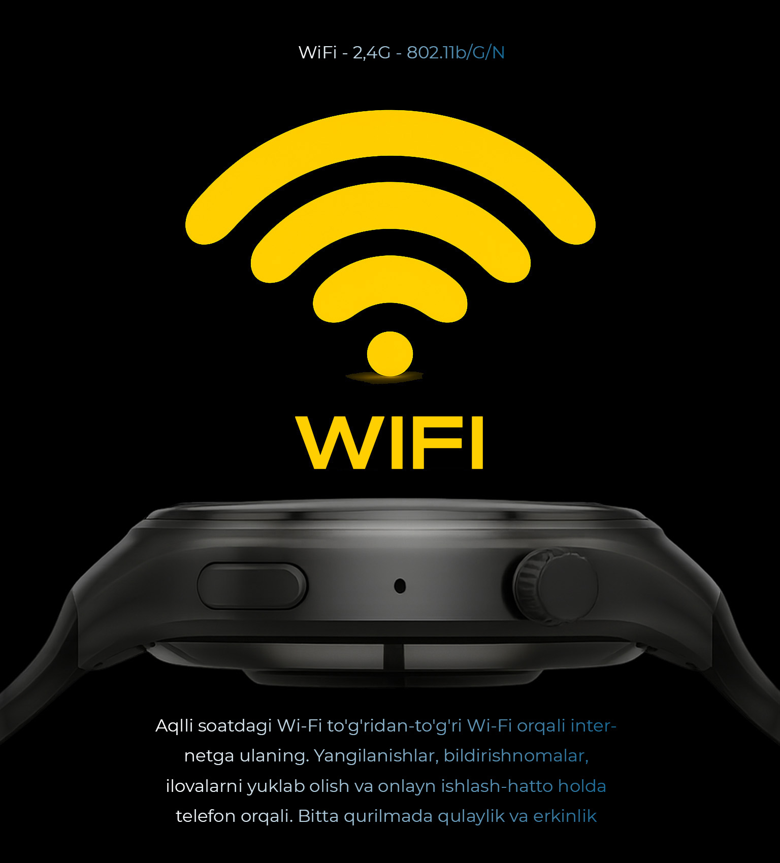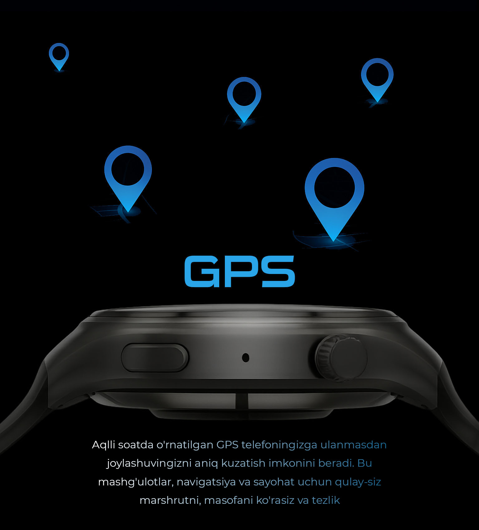 | Funksiyalar | Telefon, Kontaktlar, SMS, Brauzer, Taqvim, Kalkulyator, Musiqa, Sekundomer, Signal, Xaritalar, Xotira tozalash, Video pleer, Chiroq, Diktofon, Sport rejimlari, Yurak urishini o‘lchash, Qon kislorodini o‘lchash, Fayl menejeri, Musulmonlarga mo‘ljallangan dastur va boshq. |