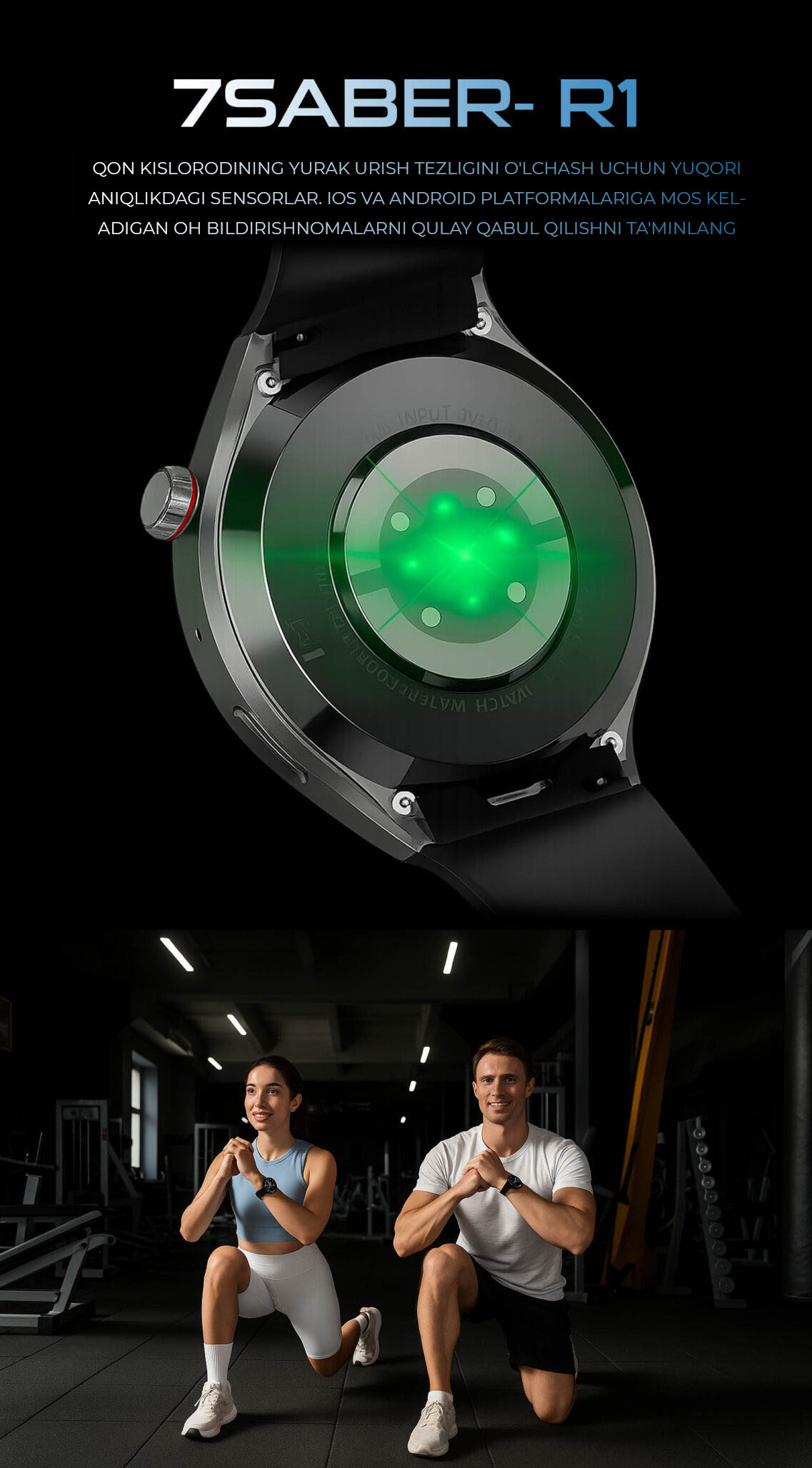 7SABER SMART WATCH SPORT BILAN SHUG’ULLANADIGANLAR UCHUN IDEAL ECHIMDIR. USHBU AQLLI SOAT BARCHA KERAKLI XUSUSIYATLARGA EGA SIZNING MASHG’ULOTLARINGIZ VA SOG’LIG’INGIZNI KUZATIB BORING.