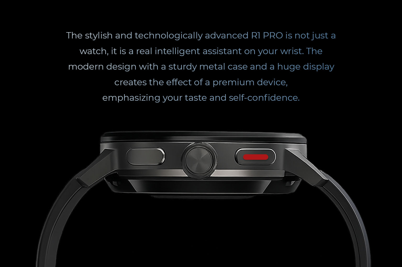 The R1 Pro watch model is the epitome of strict elegance and laconic style. The classic round case with a powerful metal rim and matte finish gives the watch a premium and solid look.